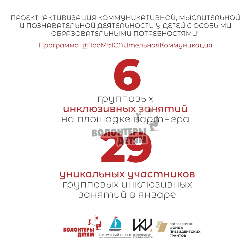 -29 детей (нормотипичные и с ментальными особенностями развития) - уникальные участники наших групповых инклюзивных занятий в январе.