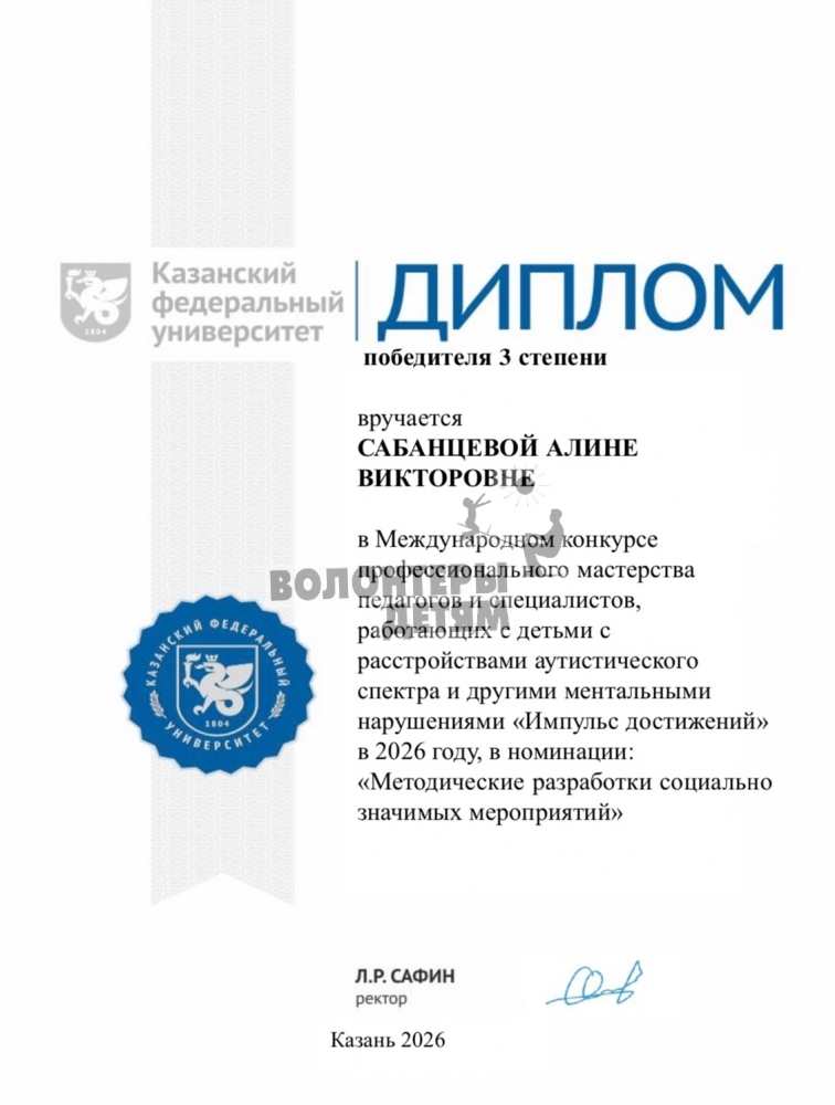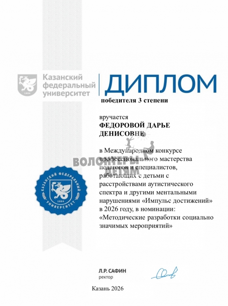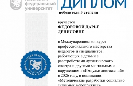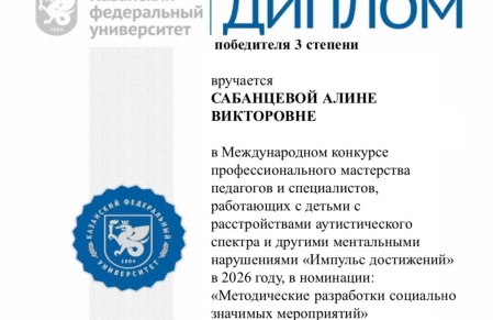 В этом месяце одна из разработок нашего специалиста по АФК Алины Сабанцевой и методиста-организатора Федоровой Дарьи заняла почетное 3 место в Международном конкурсе профессионального мастерства педагогов и специалистов, работающих с детьми с РАС и другими ментальными нарушениями. В конкурсе приняли участие более 120 специалистов из разных городов. Поздравляем!
